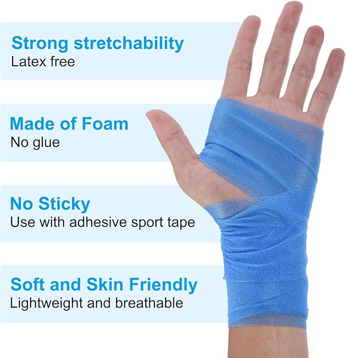 プリラップアスレチックテープはフォーム製で、ラテックスを含まず、皮膚と接着剤との直接接触を避け、保護バリアを形成します。フォームは通気性があり、防湿性があり、簡単に引き裂くことができます。
