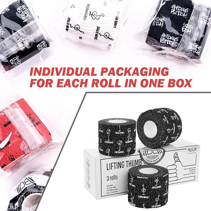 WARM BODY COLD MIND 重量挙げ、パワーリフティング、筋力デッドリフトトレーニング用でプレミアムリフティング親指スポーツテープ。フックグリップ、引き裂き可能と弾性綿、スウェットプルーフや通気性 (ブラック3ロール) | LEAD-SHOP