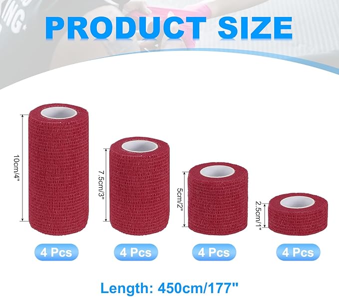 カラー:ダークレッド;素材:不織布;長さ:177"(450 cm);4つの幅:1"(2.5 cm)、2"(5 cm)、3"(7.5 cm)、4"(10 cm);梱包リスト:16個 x セルフアドヘーシブバンデージラップ(1個ごとの仕様)