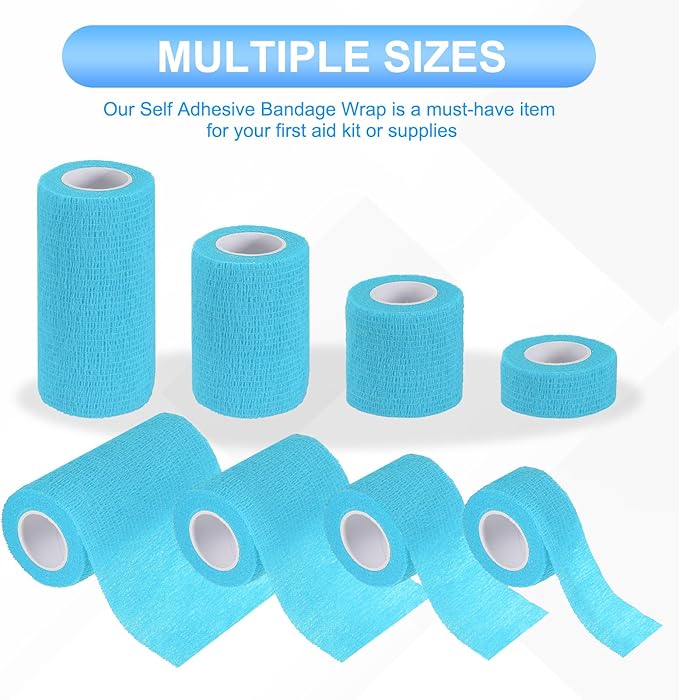 カラー:スカイブルー;素材:不織布;長さ:177"(450 cm);4つの幅:1"(2.5 cm)、2"(5 cm)、3"(7.5 cm)、4"(10 cm);梱包リスト:16個 x セルフアドヘーシブバンデージラップ(1個ごとの仕様)