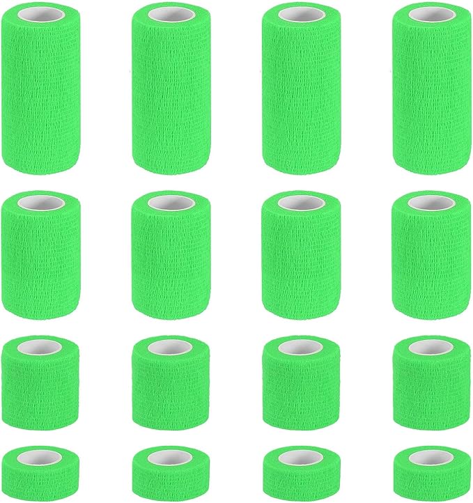 カラー:明るい緑;素材:不織布;長さ:177"(450 cm);4つの幅:1"(2.5 cm)、2"(5 cm)、3"(7.5 cm)、4"(10 cm);梱包リスト:16個 x セルフアドヘーシブバンデージラップ(1個ごとの仕様)