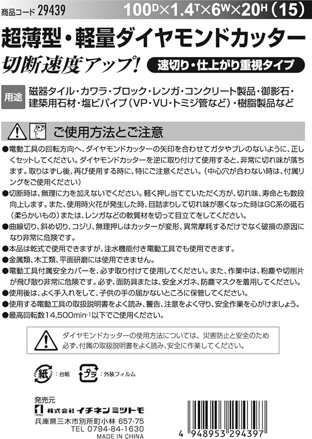 イチネンアクセス RELIEF(リリーフ) ディスクパーツ 薄型ダイヤモンドカッター φ100mm 29439