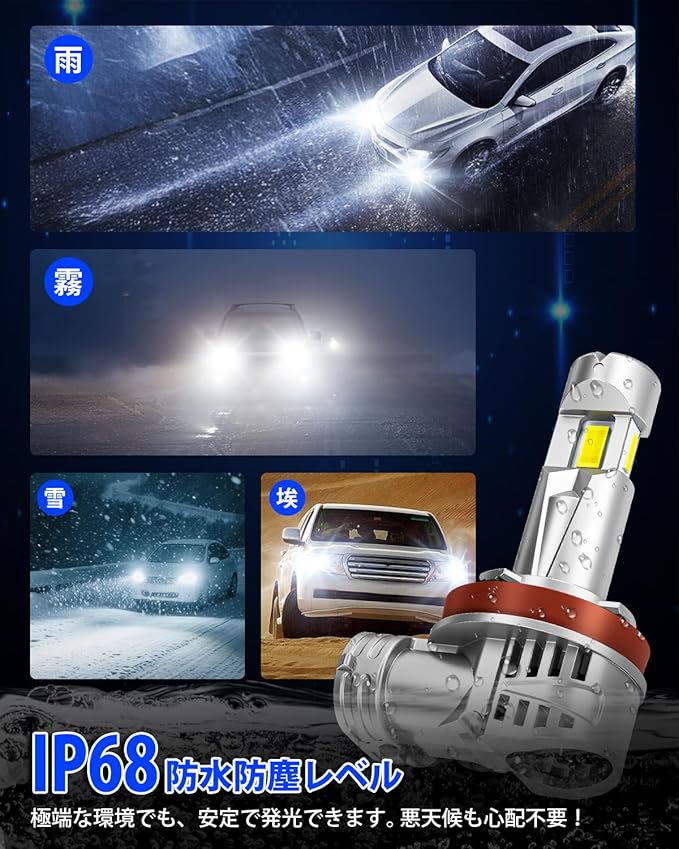 【IP68防水&視認性抜群】弊社の h11 led ヘッドライト は 雨・湿気・ホコリなど外部環境に強い設計で、さまざまな走行シーンに対応。視認性に優れた純白色(6500K)を採用し、雨の日でも路面をクリアに照らす高輝度を実現します。この目に優しい色調は、長時間運転時の目の疲労軽減にも効果的です!h16 led ヘッドライト IP68の防水防塵レベルで、低温&高温の運行環境でも瞬時点灯が可能、お客様の快適運転をお守りします