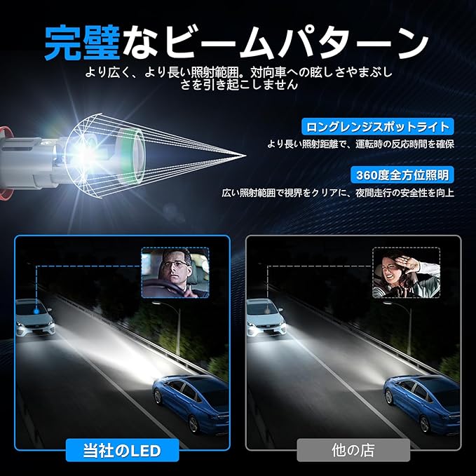 ハロゲンより800%明るい - KaiDengZhe H9/H8/H11 LEDヘッドライトバルブは驚異的な明るさを誇り、ハロゲンランプより800%明るく、先進のLEDチップにより驚異の21000LM出力を実現。生成されるクリアなクールホワイト6500Kの光は卓越した視認性を提供します。高い互換性を備えた設計で、純正H11ソケットに最適な選択肢です。
