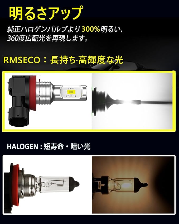 安全運転UP: 昼光色(6500K)より貫通力もっと強力で、悪天気(雨、霧、雪など)の視認性を大幅に向上させます、事故を削減し、安全運転を確保します。
