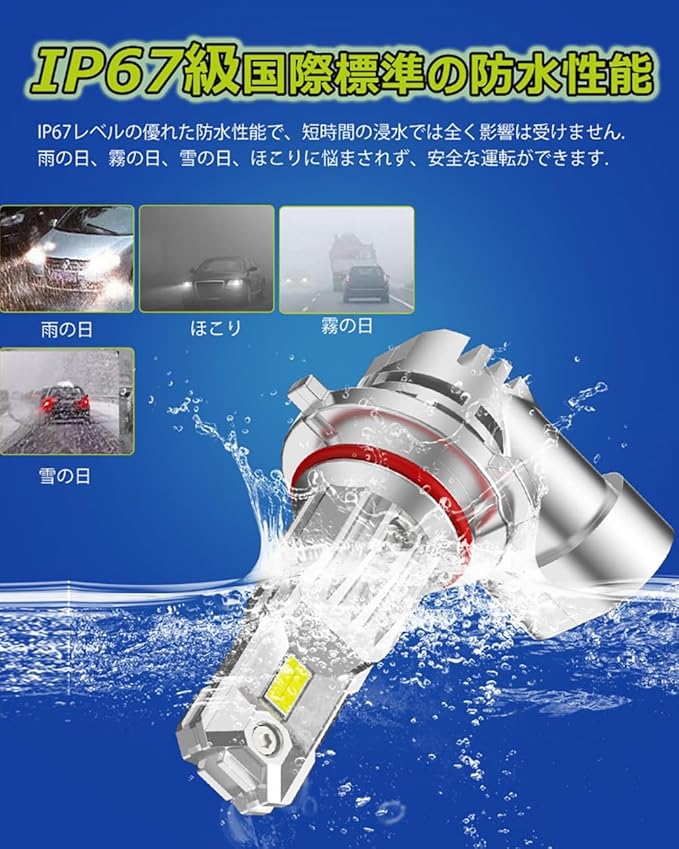 【製品情報&IP67防水】 品名:hb3 led 車検対応、ノイズキャンセラー内蔵、無極性設計、定電流保護回路搭載【ハイブリッド車・EV車対応】/ケルビン数:6000K-6500K/対応電圧:DC12V車 33W*2/輝度:約7000ルーメン/寿命:約50000時間以上/セット内容: H 11ヘッドライト 爆光*2。 【IP67防水】该HB3はIP67の防水設計を採用しております。高品質な防水材料と密封技術を使用しており、水分や湿気がランプ内部に侵入するのを効果的に防ぎます。雨天、雪天、泥濘の道路などで走行しても、安定した発光できます。お客様の安全運転をお守りします。