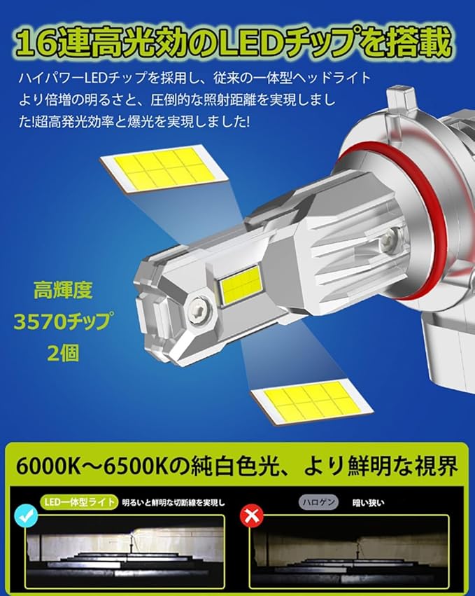 【高出力&優れた視認性】 HB3 LEDハイビームの出力は66Wで、従来の統合型オールインワンLEDヘッドライトの2倍以上の輝度がある。LEDはハロゲン電球に比べて、より正確な光分布と鮮明な切断線を実現し、集光効果が顕著で、対向車両の運転者の視線を妨げることなく、車の所有者の安全運転に強力な保障を提供する。ホワイトライトを採用し、高品質のLEDチップが発する光はより自然で、透過力が強く、ドライバーの視野をより鮮明にすることができ、走行の安全にとって極めて重要である。