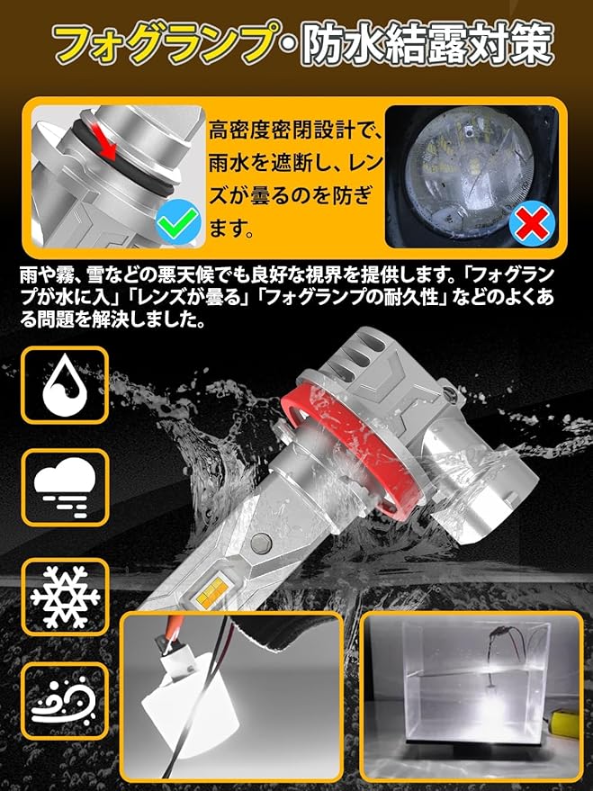 【優れた防護性能・干渉なし】日本車専用キャンセラー内蔵でラジオやナビへの干渉ゼロ。エンジン始動時や走行中でも、FMラジオの受信状態が安定し、ノイズフリーな快適ドライブを実現。本製品はIP68等級の防水・防塵性能を備えており、雨天や雪の日でも明るさをしっかりと維持します。■ 商品仕様■H11LEDフォグランプ・高効率CSPチップ採用・DC 12V車用・色温度:3000K(イエロー光)