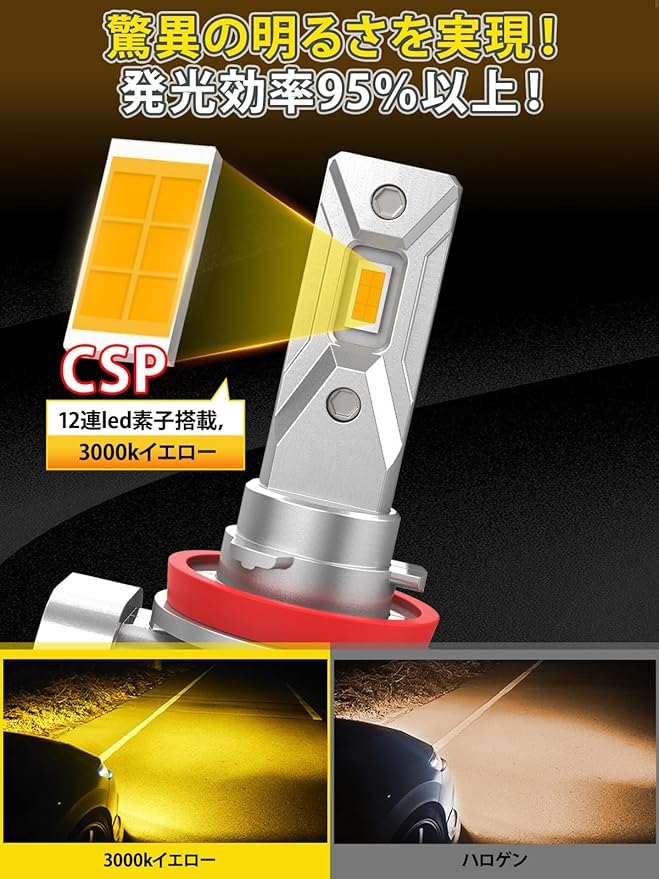 【高効率CSPチップ・3000Kイエロー】H11LEDフォグランプは発光効率に優れたCSPLEDチップを採用することで、発光色・配光・光度において、かつてないレベルの向上を実現しました。 発光色は3000LEDイエローで、純正ハロゲンバルブや白色光よりも視認性が優れています。雨の日や曇り空などの悪天候でも視界がよく保たれます。LEDヘッドライトの本体にはアルミニウム合金を採用し、一体型な設計と優れた省エネ・放熱効果により、耐久性が飛躍的に向上しています。XELORDの新型H11 LEDフォグランプは、コストパフォーマンスと実用性を極限まで追求したモデルです。