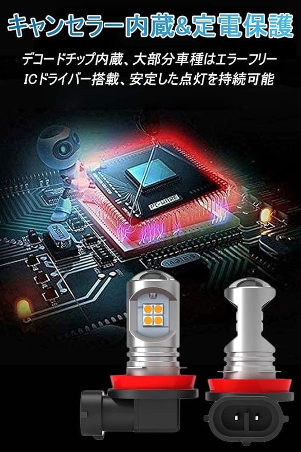 定電流回路 安定性抜群:このh8 ledフォグランプインテリジェント定電流回路を搭載。車両電圧変化にも影響されずに安定した点灯を持続します。これによりLEDにかかる負荷をおさえ、より長寿命を実現しております。ハイブリッド車両にも安心してご使用いただけます。