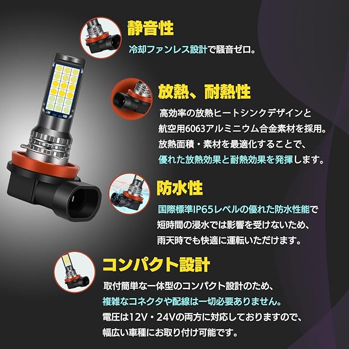 【高輝度SMDチップ搭載&3色切り替え可能】高品質のハイパワーLEDチップ3030SMDを採用することで、高輝度・低消費・長寿命を実現。全光束4800Lmの明るさで純正ハロゲンより明るく照射し、視認性が向上します。色温度は天候や気分に合わせてスイッチをON/OFFするだけで、イエロー(3000K)・ホワイト(6000K)・ライムグリーン(4100K)/アイスブルー(10000K)/ブルー(15000K)/ピンクパープル(30000K)に切り替え可能です。夜間のドライ路面では路面や側道の障害物を見やすくするホワイト光(6000K)、雪・雨・霧などの悪天候には視認性の高いイエロー光(3000K)、ファッショナブルな光を発するライムグリーン光(4100K)/アイスブルー光(10000K)/ブルー光(15000K)/ピンクパープル光(30000K)で事故防止・快適運転をサポートします。