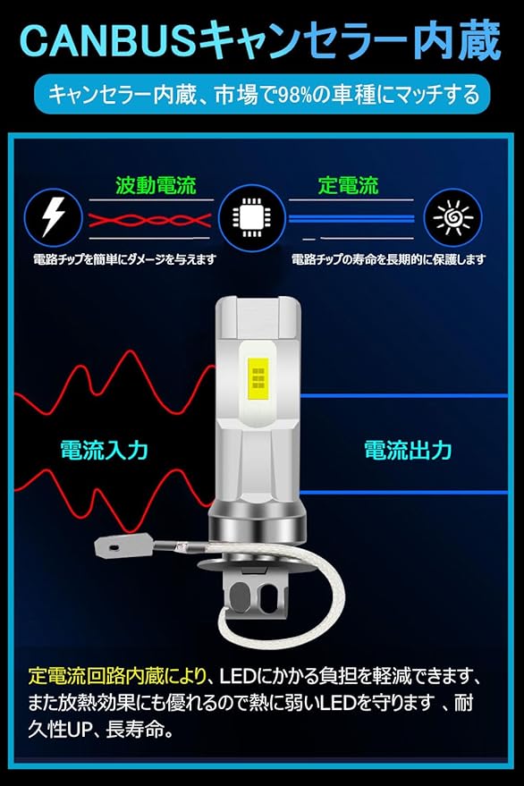 超高発光効率CSPチップ:この h3 led は高品質 3570 LEDチップ採用、発光効率が大部アップ!両面チップ搭載、均一で、高効率の発光を持って、明るさと安定性を大幅に向上させることで、視認性の高い、通常のハロゲンバルブより大きな贯通力を持つ、雨や霧、雪などの悪天候にしても良い視野を提供します。
