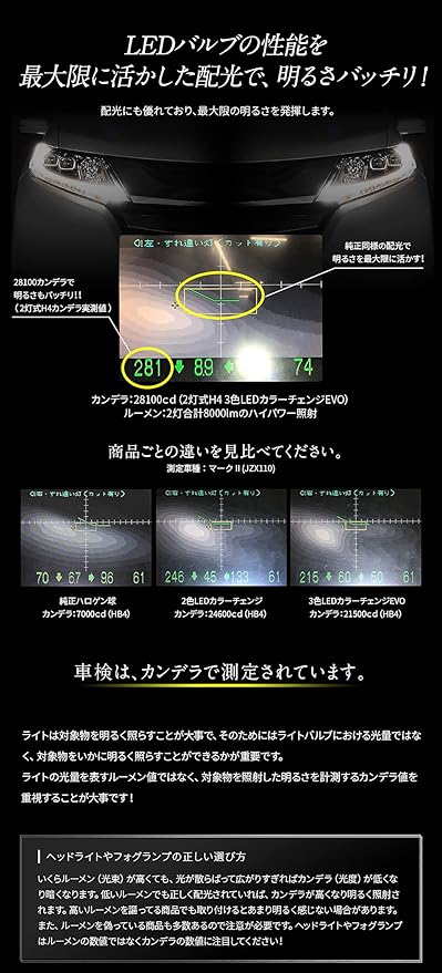 【LEDバルブの性能を最大限に活かした配光】信玄LEDカラーチェンジバルブEVOは、配光にも優れており最大限の明るさを発揮します。なんと28100カンデラのハイパワー照射(2灯式H4カンデラ実測値)。車検はカンデラで測定されており、ライトバルブにおける光量ではなく、対象物をいかに明るく照らすことができるかが重要です。ヘッドライトやフォグランプを選ぶときは、カンデラの数値に注目してください。