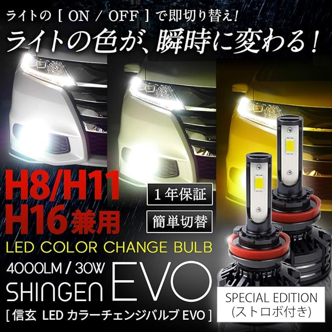信玄 LEDバルブ カラーチェンジバルブ EVO ストロボ機能付 H8 H11 実測値21500cd フォグ