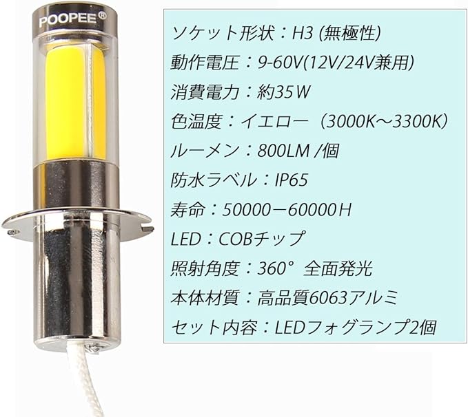 LEDフォグランプ H3 黄色 イエロー-POOPEE 35W 800LM 12V/24V兼用 無極性 COBチップ360 発光 高輝度 2個セット