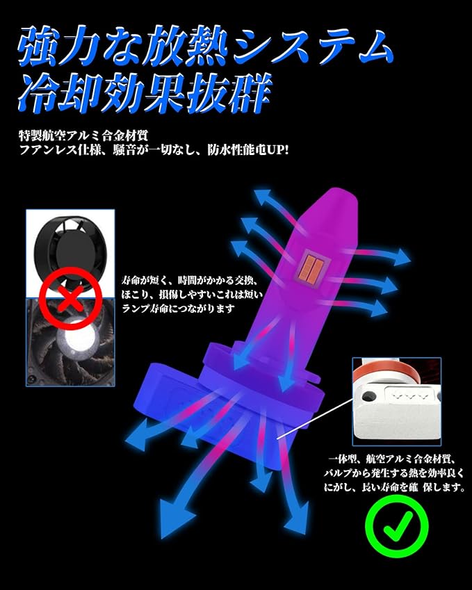 放熱性を実現!ファンレスの仕様で、騒音が一切なし、防水性能もUP! H11 LED素子の耐久性もアップでき、