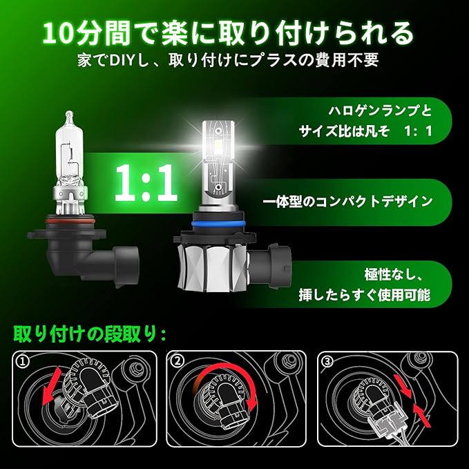 10分間で簡単に取り付ける、挿したら即使用可能: 優れた機能で、ハロゲンランプはほぼ1:1比率のサイズを保っている。AutoyesのLEDフォグランプはプラスの改修なしに自動車のオリジナルのコンセントに挿入可能。家でDIYし、取り付けにプラスの費用不要。