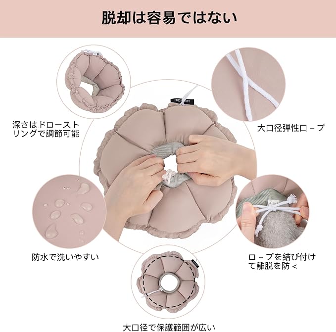 「ソフトな防水素材」 は防水PPコットンを使用しているので、飲用時に濡れる心配がなく、ペットの傷口を乾燥した環境に保つことができ、傷口の回復に役立ちます。 柔らかい素材はペットや家具を傷つけず、滑らかな表地は夏でもペットに暑苦しさを感じさせません。 就寝時の枕としても使用できます。