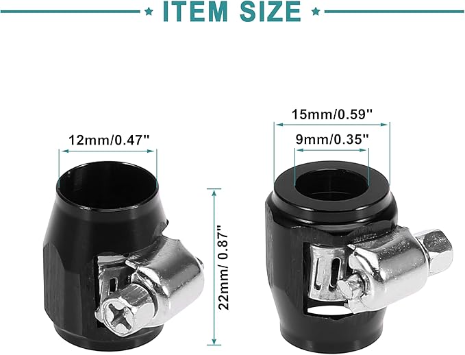 サイズ:AN4 寸法:22mm(H) 適合ホース最大外径:12mm 穴外径:15mm 穴内径:9mm クランプ幅:6-10mm
