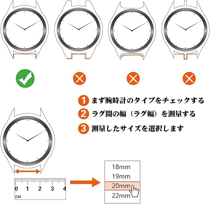 ラグ幅(時計ラグ間のサイズ)18mm/19mm/20mm/22mmの時計に適用します。