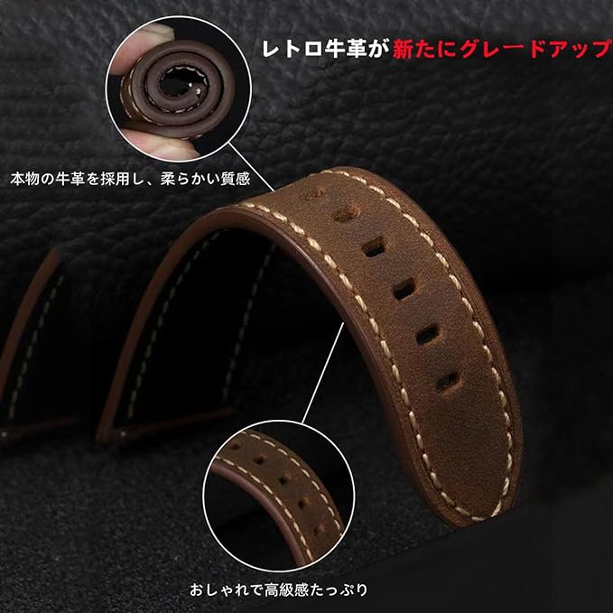 【商品情報】柔らかくて装着感が良い本革のクレージーホースレザー(crazy hose leather)を使用しています。半艶消しの表面でレトロなスタイルが特徴です。ステッチされていて頑丈で耐久性があります。柔らかくて質感、縫製が優良な復古風腕時計ベルトです。