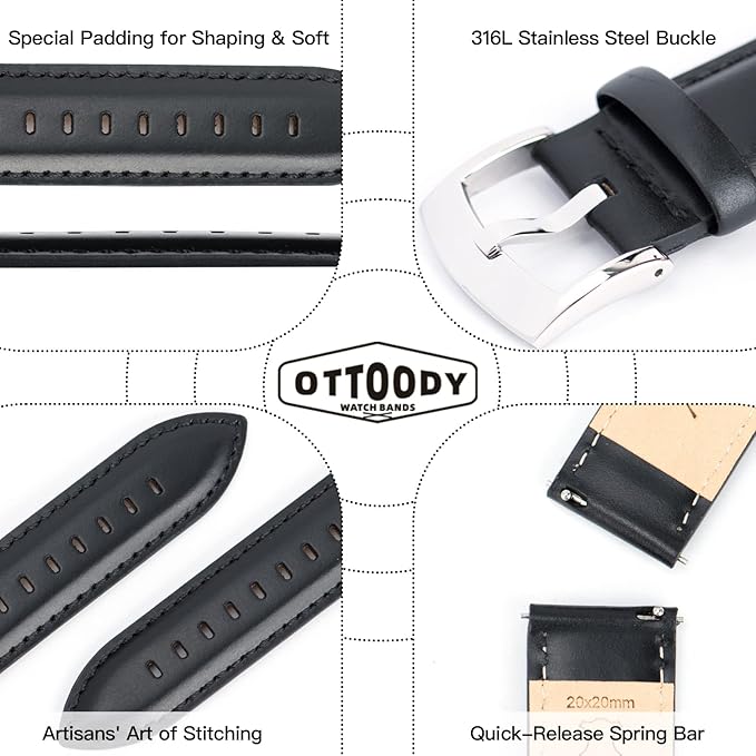より強力なステンレス鋼のハードウェア:高品質の時計バンドには、高級革だけでなく高品質のハードウェアも必要です。より強力な316Lステンレス鋼を使用して、正常に機能するバックル、スプリングバー、ピンを信頼性の高い耐久性のあるものにします。 OTTOODYのバックルは、手首やストラップにぴったり合うように適切に湾曲しています。全体的に、高品質の素材と人間味のあるデザインは、細かいディテールと職人技のレザーウォッチストラップを備えています。