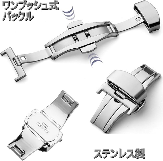 バックルはダブルフォールディング ワンプッシュ式(両開き式/観音開き式)の形状で本革部分はクロコ型押し(牛)となっております。ワンプッシュ式ですので、つまむだけで簡単に外せます。
