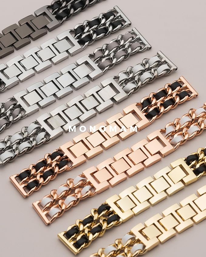 日本発コンパクトスマートウォッチブランド「Monomam(モノマム)」からステンレスバンドに本革を編み込んだチェーンベルトが登場。ステンレスと本革の組み合わせでよりモダンな印象に。女性の腕回りにアクセサリー感覚で身につけらるデザインをコンセプトに別注を行いました。人気のROSEGOLDから定番カラーのSILVER・GOLD・BLACKで取り揃え、高品質のステンレス素材を使用し、高級感あふれるステンレスバンドに仕上げました。コーデのアクセントにおすすめのステンレスバンドです。