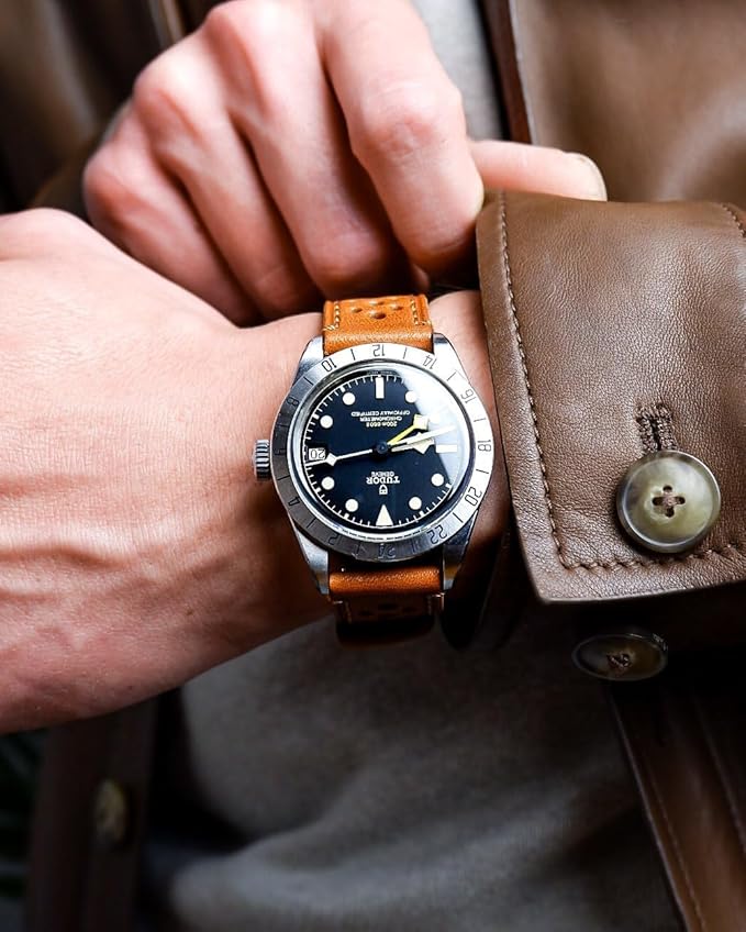 2.バンドのメリット:ステッチとレザーがヴィンテージ感を演出。バンドの厚さは約2mm。また、316ステンレスのバックルを使用しているため、頑丈で耐久性に優れています。