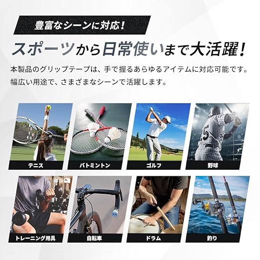 【豊富なシーンに対応】本製品のグリップテープは、テニスやバドミントンの他、釣り、太鼓のバチ、トレーニングバーベル、ダンベル、自転車、バイクのハンドル、釣竿のハンドル、ハンドルクリートなどの手で握るものに幅広く対応しています。