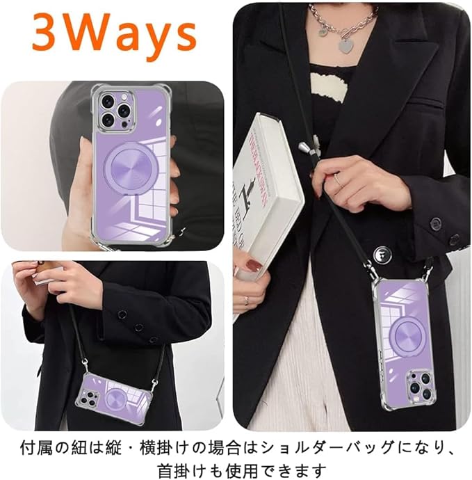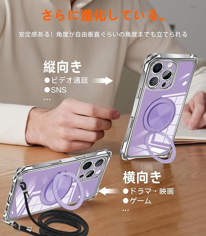 【互換性モデル】iPhone 17 Pro Max 適用 ケース。※ご注意:ご注文する前に、必ずお買い求めの機種とカラーを確認してください。 【360 回転スタンド 縦も横も思いのまま】iPhone 17 Pro Max 用ケースは、革新的なスタンドデザインを採用しています。ケースの携帯性や省スペース性を新たなレベルに引き上げました。さらに、縦向きでも横向きでも安定して置くことができます。0 ~120 の間で自由に調整できます。動画視聴、オンライン授業、リモート会議、ビデオ通話などで大活躍、あらゆる視聴の瞬間をお楽しみください。 【全面保護】優れた保護性能,耐久性に優れた、傷がつきにくい,衝撃吸収性の高いTPU素材,衝撃やキズ、埃などからしっかりとスマホの背面を守ります。で落下衝撃から本体をしっかりと守ってくれます。フチをわずかに高く設計することで、日常生活の消耗に耐えしっかり保護できる、スマホへの傷つけを防止します。スマホを落としてしまっても衝撃を最小限に抑えるケース。専用にオリジナル設計しているためぴったりとフィットし、保護性能には欠かせないポイントとなっています。 【長さ調整可能 & ストラップの脱着が1秒で可能】調節可能なストラップにより、サイド、またはフロントに持ち運べるときに完璧にあなたの隣に掛けることができます。 このアクセサリーはファッションだけでなく、通常のストラップよりも快適で実用的です。それらは非常に耐性があり、湿気を吸収せず、無臭で乾燥しています。 それはあなたの手に自由を与えます。 ネックストラップはお好みの長さに調節できます。ストラップはいつでも取り外して身につけることができます、好きなように着こなす。