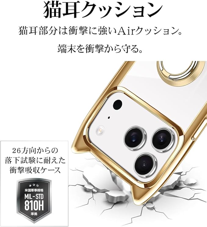 for iPhone 17 Pro Max 専用 ケース クリア カバー TPU 猫耳 リング付き リングホルダ かわいい おしゃれ スタンド付き ストラップホール アイフォン17プロマックス スマホケース 多機能 全面保護 落下防止(ゴールド)