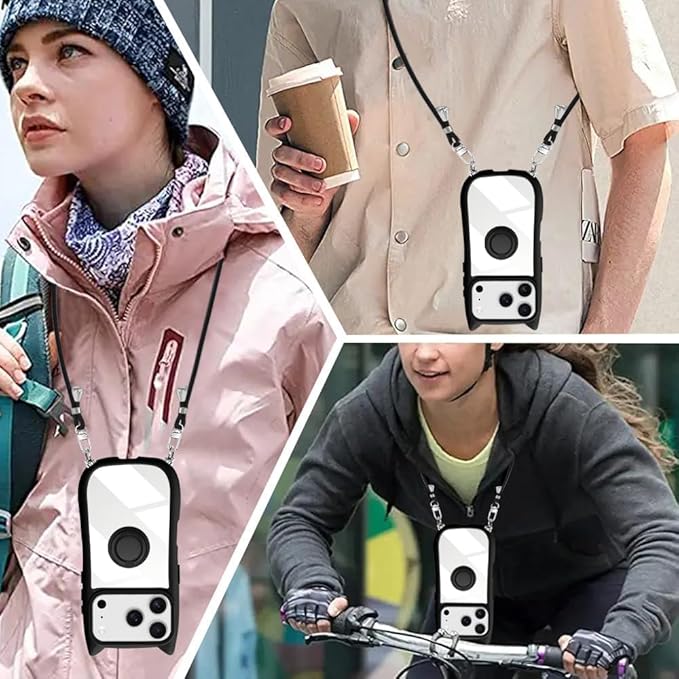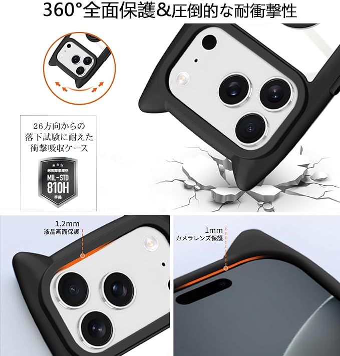 for iPhone 17 Pro Max ケース ショルダー クリア カバー リング付き 隠しスタンド 猫耳 ネコミミ 背面ガラス かわいい おしゃれ スタンド付き ストラップホール アイフォン17プロマックス スマホケース 多機能 全面保護 落下防止(ブラック)