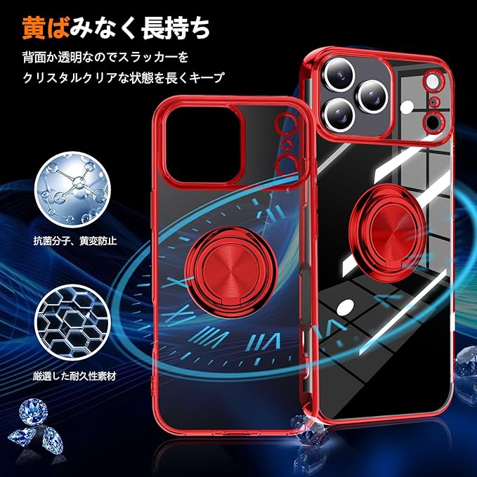 対応 iPhone 17 Pro Max 用 ケース リング付き クリア 耐衝撃 スタンド機能 透明 TPU 車載ホルダー対応 落下防止 防塵 薄型 軽量 一体型 変形防止 保護カバー アイフォン 17 プロ マックス 用 カバー 赤 W-YXZH-87-02