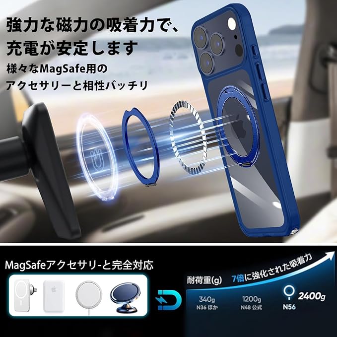 For iPhone 17 Pro Max 用 ケース クリア ショルダー 多機能360度回転スタンド MagSafe対応 調節可能 ストラップ付き ワイヤレス充電 耐衝撃 カメラレンズ保護 いphone17 プロ マックス 対応 マグセーフ マグネット搭載 透明 PC + TPU 肩がけ 首掛け 紐付き 耐衝撃 全面保護 おしゃれ アイフォン カバー (ブルー)