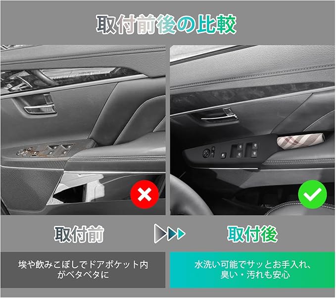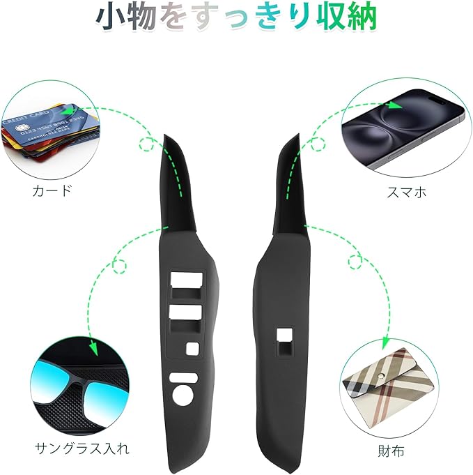 【防音・滑り防止・キズ防止】柔らかいドアスイッチパネル保護カバーは、カードや時計などの硬い物による傷からボディパネルを効果的に保護します。デリカD5純正パーツのようなピタッとフィットする1:1 設計で、緊急ブレーキ時の車の振動を吸収し、ブラケットやコインなど小物の滑りや転がりによるノイズを軽減します。汎用収納ボックスの「隙間が気になる」「走行中のガタつき」といった悩みを解消します。