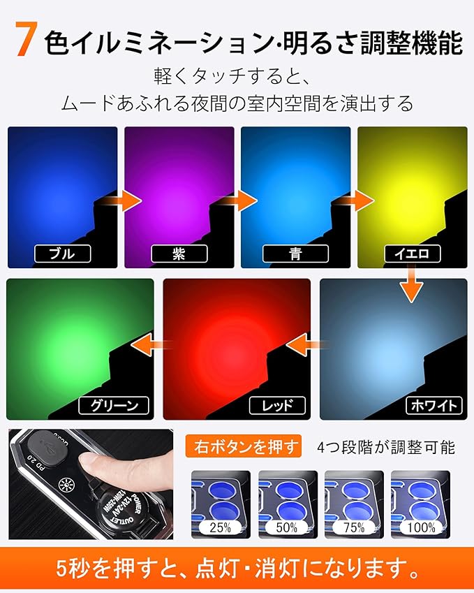【7色LED付き&4段階輝度調整】様々なシーンに応じて、段階(100%・75%・50%・25%)の明るさ設定できます。ワンタッチでライトカラーを自由に切り替え、自動変色モードも搭載し、車内雰囲気をお好みでカスタマイズできます。夜間の照明はもちろん、遊び心も満載。