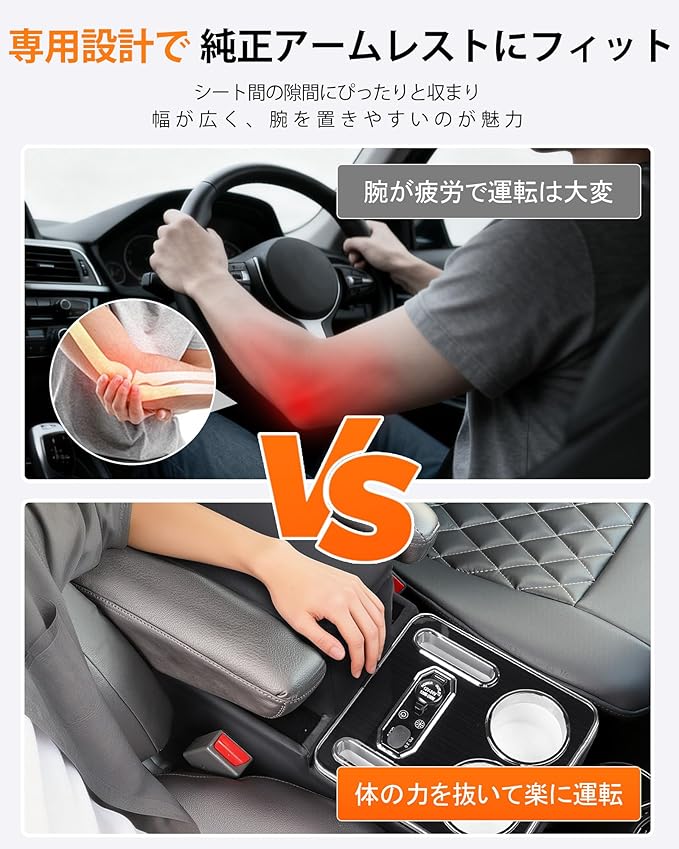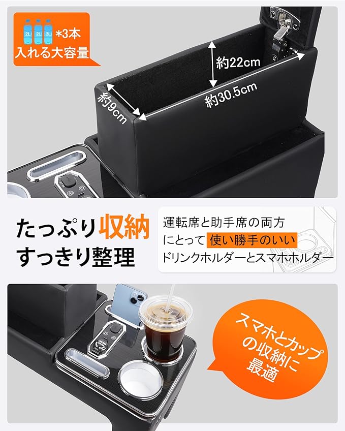 【抜群の収納力&快適な肘置き】純正センタコンソールの収納不足を解消するため、大容量収納ボックスに加え、運転席・助手席両用のカップホルダー&スマホホルダーを標準装備します。散らかりがちな空間をスッキリ整頓。PUレザー調の高級質感と、適度なクッション性を持つアームレスとしては、見た目も触り心地も上質で、長距離ドライブの快適性を大幅に引き上げます。