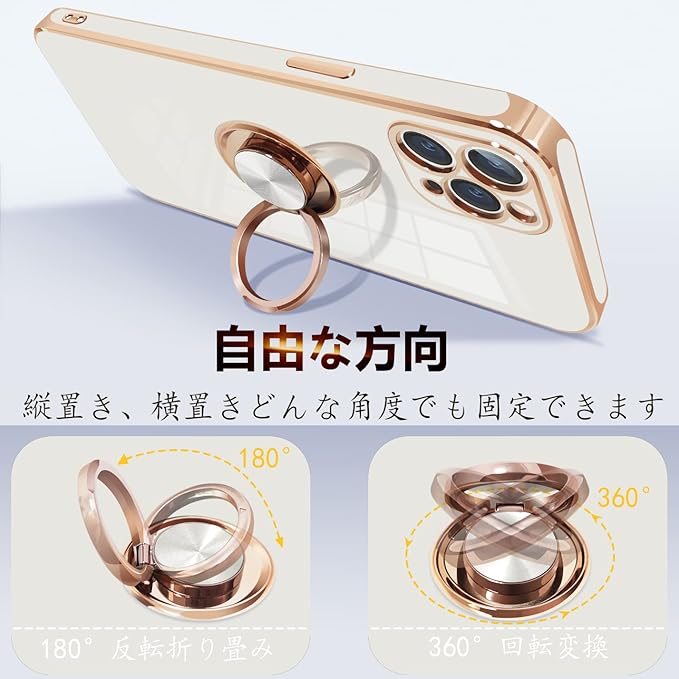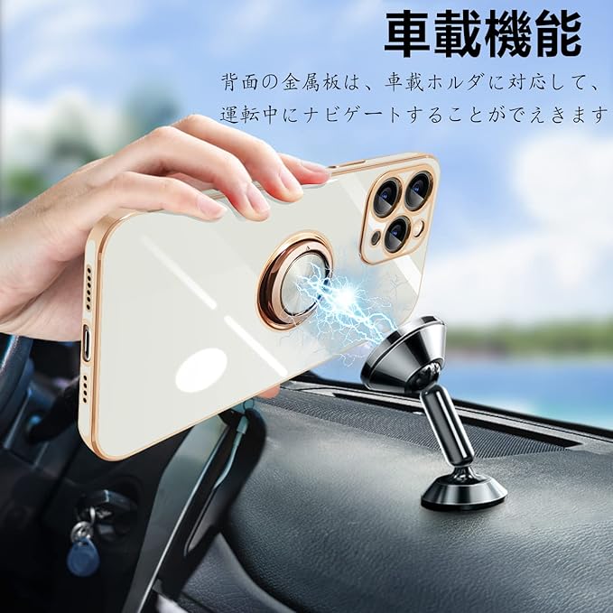 iPhone11 Pro Max 用 ケース リング付き アイフォン11promax リング カバー 耐衝撃 TPU メッキ加工 360 回転 スタンド機能 車載ホルダー ストラップホール付き 6.5インチ(ホワイト)