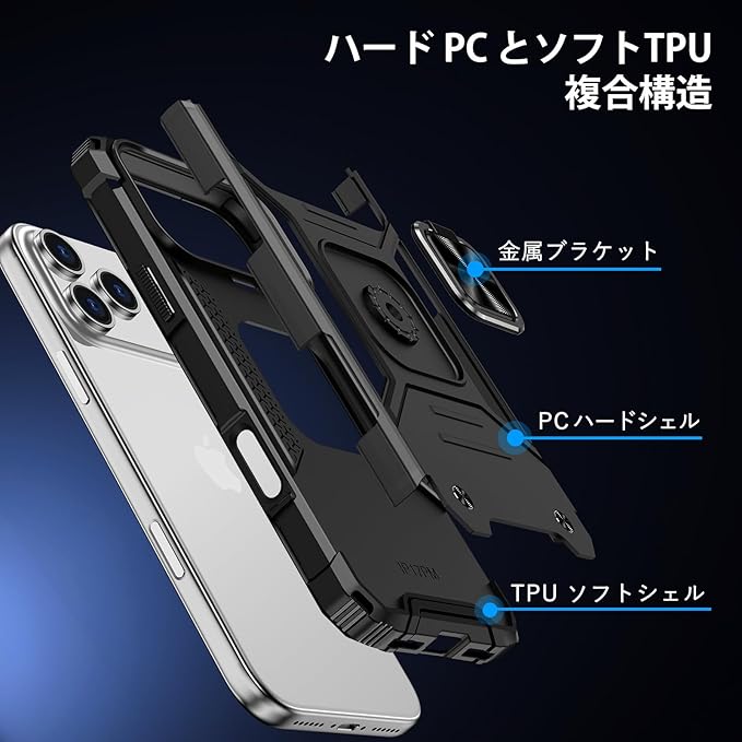 対応機種:iPhone 17 Pro Max 専用;対応機種を間違いないようにご購入お願い申し上げます機体と密着、長持ちで手疲れしにくい:精巧をきわめている孔位で、充電やイヤホンによる音楽聴取に支障なく使用でき(注:本ケースを装着した場合、ワイヤレス充電に対応していません;ワイヤレス充電を行う場合は、ケースを取り外してください);カメラボタン、電源ボタンなどにピッタリ合い、ケースを外さなくても撮影可能です;埃がつきにくく、軽く拭くだけで光沢を復元できます優れた耐用性:高品質 TPU+PC 素材で製造されるため、丈夫さと柔軟性を兼ね備え、着脱しても機体を傷付けにくいし、擦り傷を効果的に防止でき;落下時の衝撃を軽減する設計となっていますリング付きスタンド機能:背面に嵌め込み式リングが付いており、伝統的なリングと比較して、より良好に水平安定性を維持できます;ケースを横向きにするとスタンド機能に切り替わり、携帯を横置きできるため、いつでもどこでも音楽、FaceTime、映画などの娯楽を思い切り楽しめます;360 度回転、120 度調節が可能で;片手で携帯を操作できるほか、滑り止めや落下防止の効果もあります車載スタンド対応:内蔵メタルシートのデザインにより、車載ホルダーに強く吸着できます