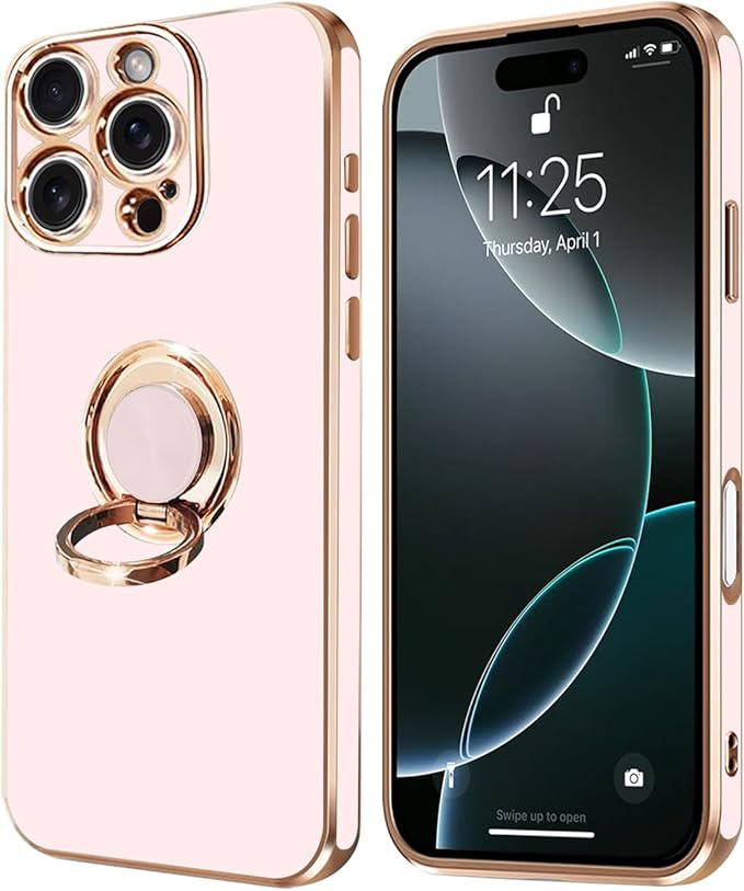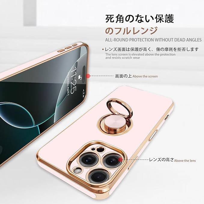 For iPhone 16 Pro Max 用の ケース リング付き アイフォン16Pro Max 用の リング カバー 全面保護 スマホケース TPU 耐衝撃 スタンド機能 車載スタンド対応 ストラップホール付き 擦り傷防止 メッキ加工 6.9インチ(ピンク)