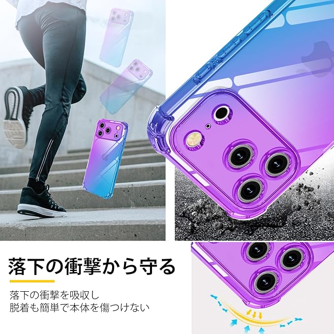 For iPhone 17 Pro Max ケースクリア TPU 薄型 軽量 グラデーション色 ケース アイフォン 17 Pro Max 用 カバー 耐衝撃 米軍MIL規格取得 滑り止め 黄変防止 防塵 一体型 人気 携帯カバー(パープルブルー)
