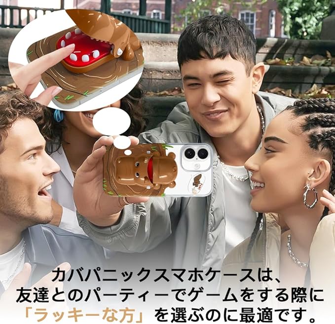 【カバパニック】リラックスできる簡単なゲームとスマホケースを一体化した製品で、非常に使いやすい設計です。 さらにスマホスタンドとしても使用可能で、背面にはカバの形をしたおもちゃが付いています。使用方法の具体的な説明は画像で確認できます。