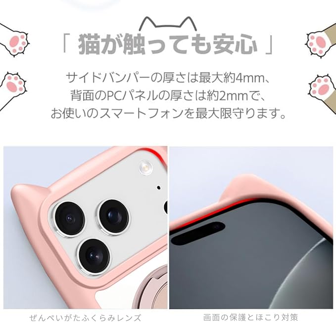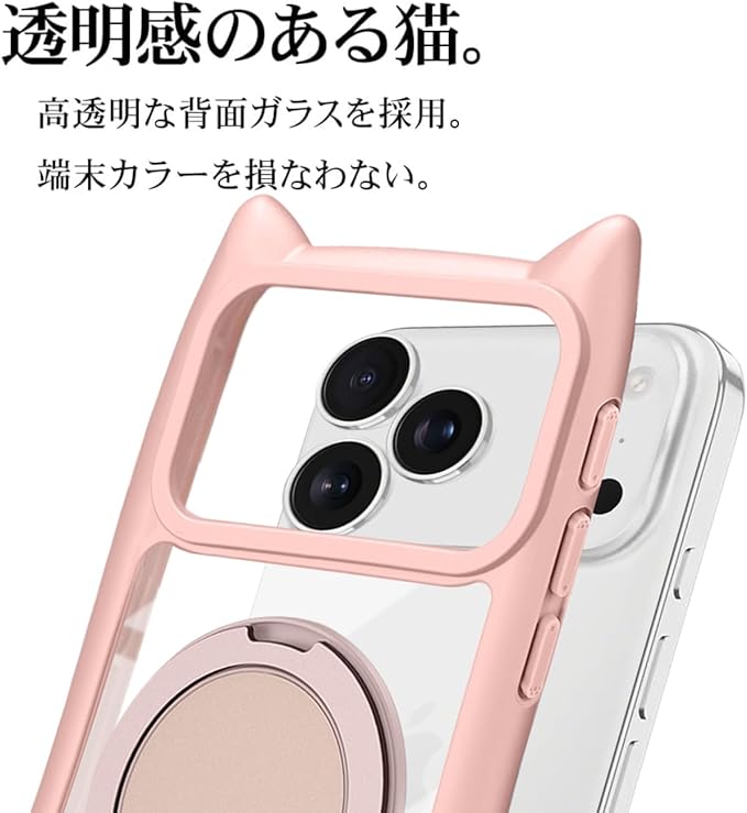 iPhone 17 Pro Max 専用 ケース クリア リング付き カバー ハイブリッド 猫耳 ネコミミ 背面ガラス クリア かわいい おしゃれ ストラップホール アイフォン 17プロマックス スマホケース 多機能 ワイアレス充電対応(ピンク)