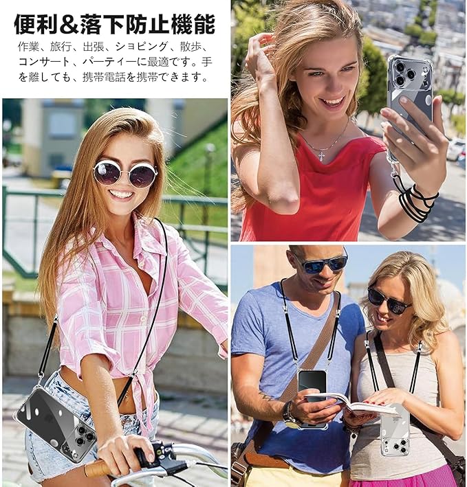 【実用・縄掛けケース】ショルダーストラップ付き、取り付けや長さ調整が非常に簡単。特にポケットのない服が多いので、外出時に肩にかけるととても便利です。ショルダーストラップは取り外し可能なので、それを使わなくても簡易的なスマホケースとして使用することができます。外出、登山、買い物、自撮り、電車内の時など日常生活からできるスマホ紛失・落下防止できるスマホネックストラップリングで両手を自由にし楽な日常ができます。