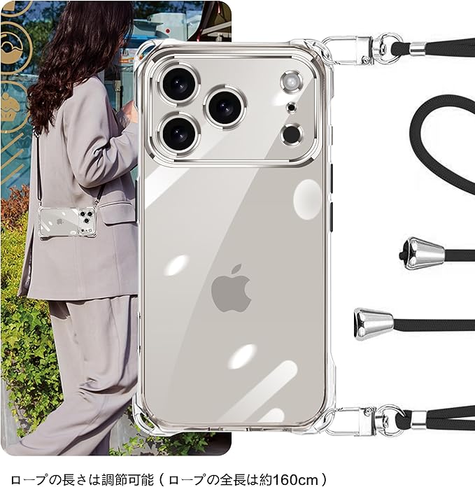iPhone 17 Pro Max 用 ケース アイフォン17プロマックス ケース クリア ネック ショルダー ストラップ付き いphone17pro max カバー 耐衝撃 薄型 軽量 TPUスマホ シリコン カバー 紐付き 斜めがけ 肩掛け 調節可能な クロスボディ ファッションデザイン(透明)