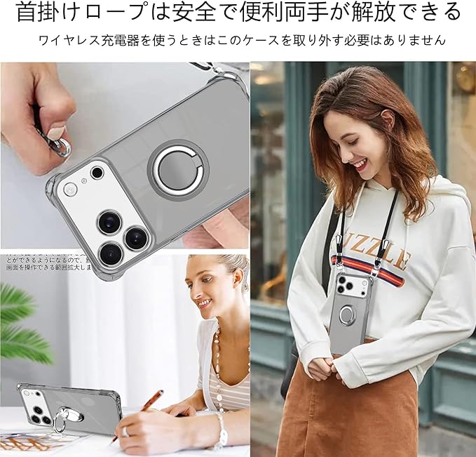 【リング付き機能】ケースを横置きにするとスタンド機能になり、持たず動画鑑賞などを楽しむことができます。リングは360度回転可能、180角度調節可能。一指着る式で、指がリングに通り抜け、片手で携帯を操作でき、落下防止します。ケースは柔らかいTPU素材を使用し、本体との擦れを防げ、ケースの着脱も簡単にできます。落下時には衝撃力を分散し、大事なデバイスを全面保護します。柔らかいナイロンストラップで首を快適に保ち、ストレッチの長さを調整でき、ストラップを取り外して、電話ケースを単独で使用できます。