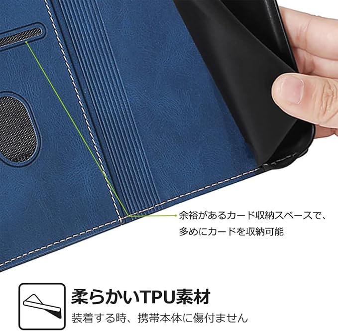高品質なTPUとPUを利用することで良い手触りと耐衝撃性を実現 ●本体を固定するカバーはTPU素材のソフトケースなので脱着が簡単。ポリカーボネートの固い素材ではないので、脱着時に本体を傷つける心配がなく、落下時にカバーが破損することも無いので安心してご利用いただけます。●レザーのカバーはTPUケースよりも少し大きめに設計されており、どのような落下でも、衝撃が直接スマートフォンに伝わらないので安心です。●外部は上質なPU革素材を採用、傷や汚れが目立ちにくく長く使え、放熱性にも優れています。