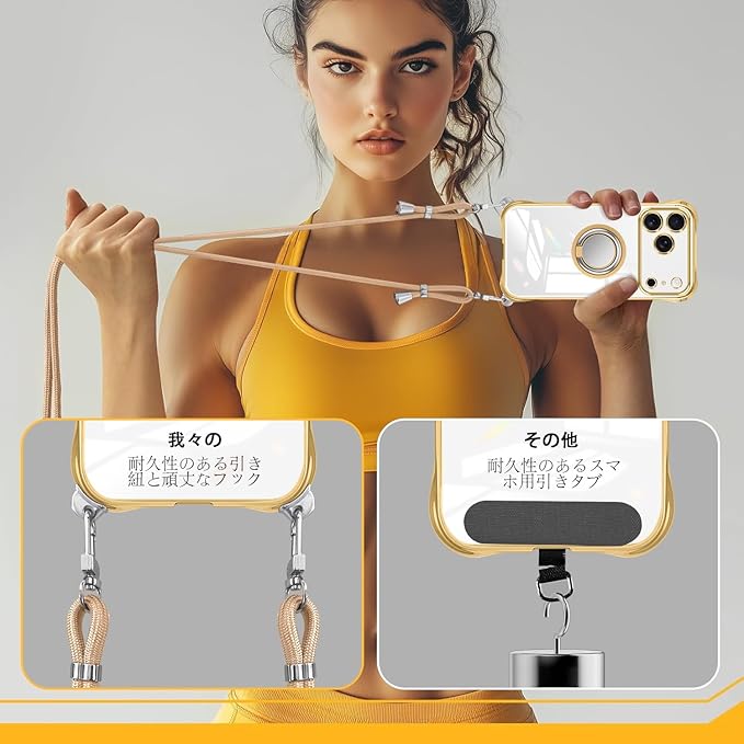 iPhone 17 Pro Max ケース クリア ネック リング付き ショルダー アイフォン17 pro max カバー 耐衝撃 対応 いphone 17 pro max スマホケース 360 回転スタンド 肩掛け 斜めかけ 縄掛け ケース 透明 TPU ストラップ付き 薄型 軽量 紐付き ネックストラップ ショルダー 肩掛け 縦/横 2WAY 長さ調整可能 取り外し可能(ゴールド)