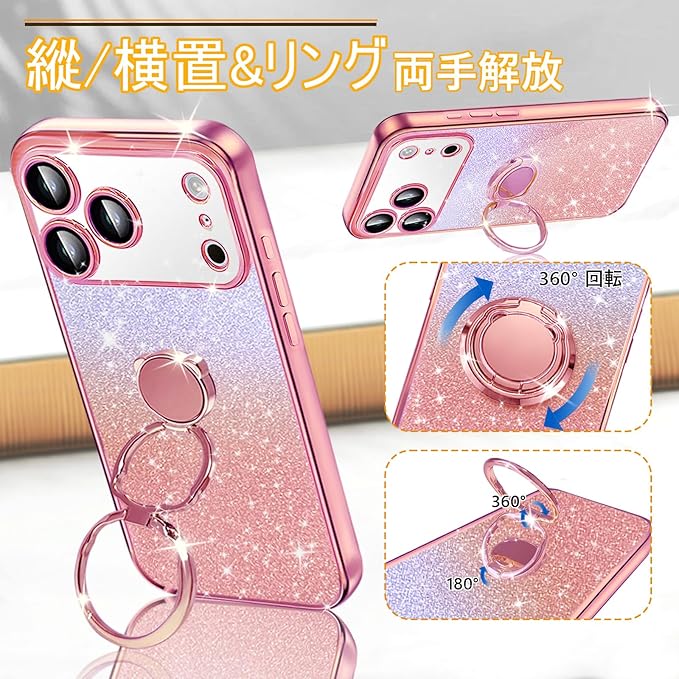【多機能一体型スマホケース・360度回転スタンド付き】弊社のiPhone 17 Pro maxケースはリング一体型設計です。市販されている一般的なスマートフォンリングは短くて小さく、さまざまな角度に調整できません。弊社の製品は360 回転のベース、180 回転第一リングと330 回転第二リングを備えた新しいデザインを採用しています。独創的なリング構造は4500回の折り畳みテストを経ても安定してゆるまず、縦方向でも横方向でも安定して使用できる。横長・縦長の画面表示、ビデオ会議、ライブ放送の撮影など、さまざまなシナリオに非常に適しています。